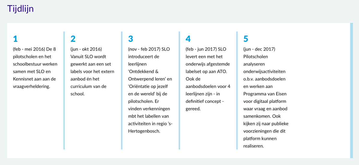 Ik geef een willekeurig voorbeeld uit de praktijk. Voor een van de websites waarvoor ik werd ingehuurd als copywriter was een tijdlijn ontworpen. Maar waar je in de koppen jaartallen of een datum zou verwachten, is gekozen voor nummers. Ironisch genoeg is er in de koppen van de tijdlijn nu geen plek meer voor dat waar een tijdlijn om draait: een tijdsperiode. De data zijn daarom noodgedwongen in het contentveld ingevoerd. Zo moet je met content het design fixen. Dat had niet gehoeven als de designer had gewerkt met echte content.